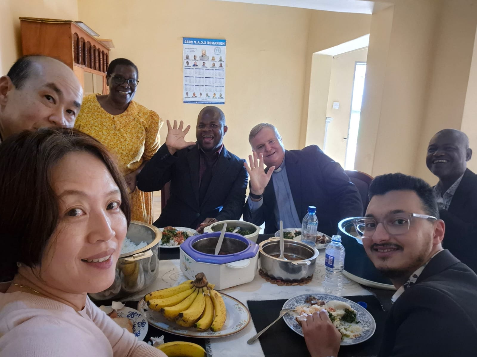 The evening sun was going down, and the sunset was spectacular. From the unfinished church building we had an amazing view of the distant Mt Mulanje, and the Shire River, along which David Livingstone once travelled. The road back to the accommodation to Thyolo was as unforgiving as before. Hui's team arrived back safely a little after 6pm, and joined the other team members for dinner at 6:45pm.
