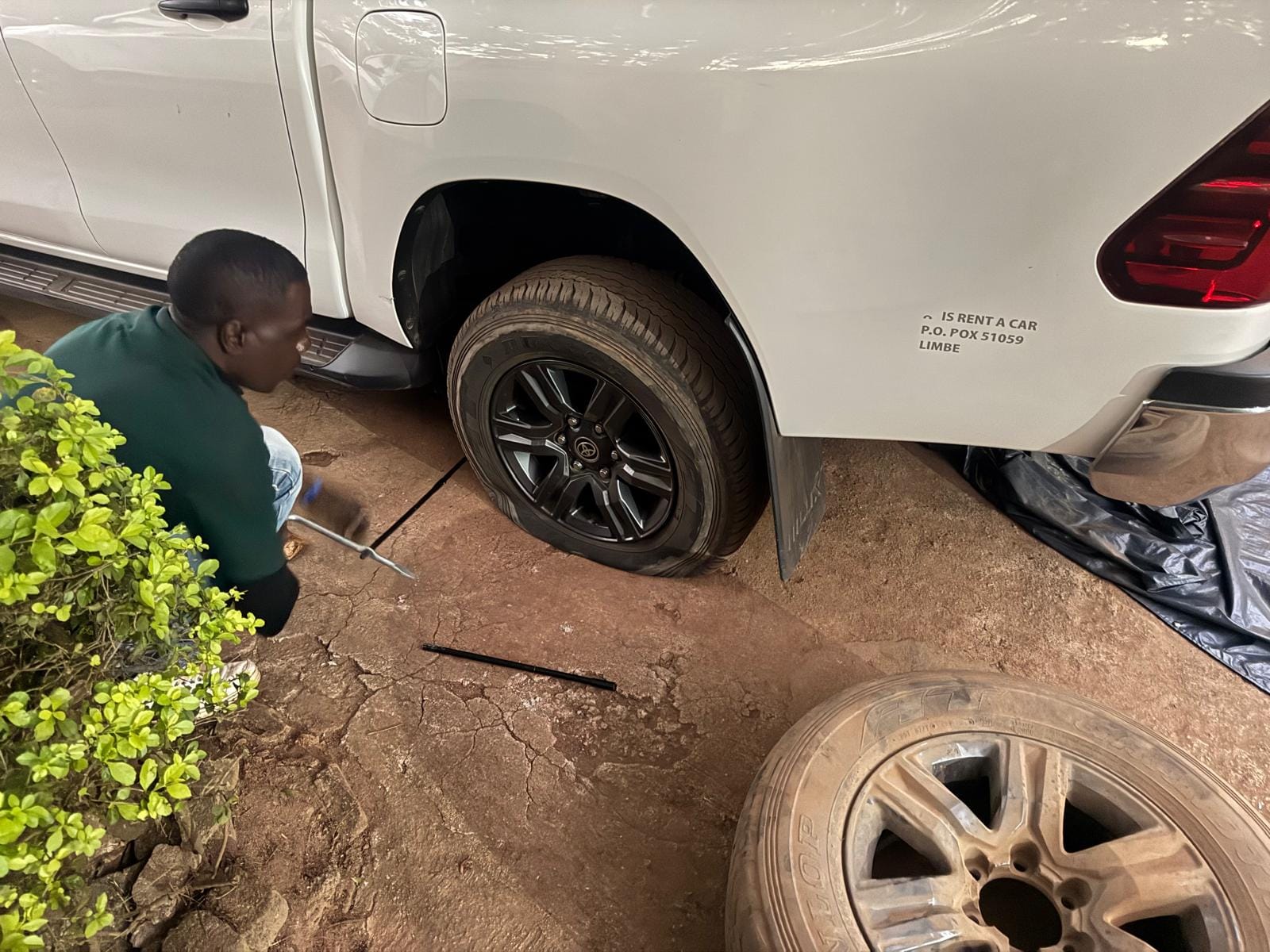 5:30am on Sunday morning, we were woken with the news that the Dayspring (Hui's vehicle, sponsored by PWMU) had a punctured tire. Immediately, we were thankful to God for keeping us safe the day prior, the tire surviving until after we had returned to our lodge. Together with the night watchman and local mechanic, Michael attempted to change the tire; only to find it stuck fast even with the car jacked up and the nuts removed. Finally, after those who were awake prayed together, and prayed over the phone with family back home, God answered our prayers! Steve wandered out, barely glanced at the wheel, gave it a single solid kick, and off it came. Indeed God is good, and provides us with all our needs, protecting us along the roads after the sun has set and delivering us to do his work each morning!